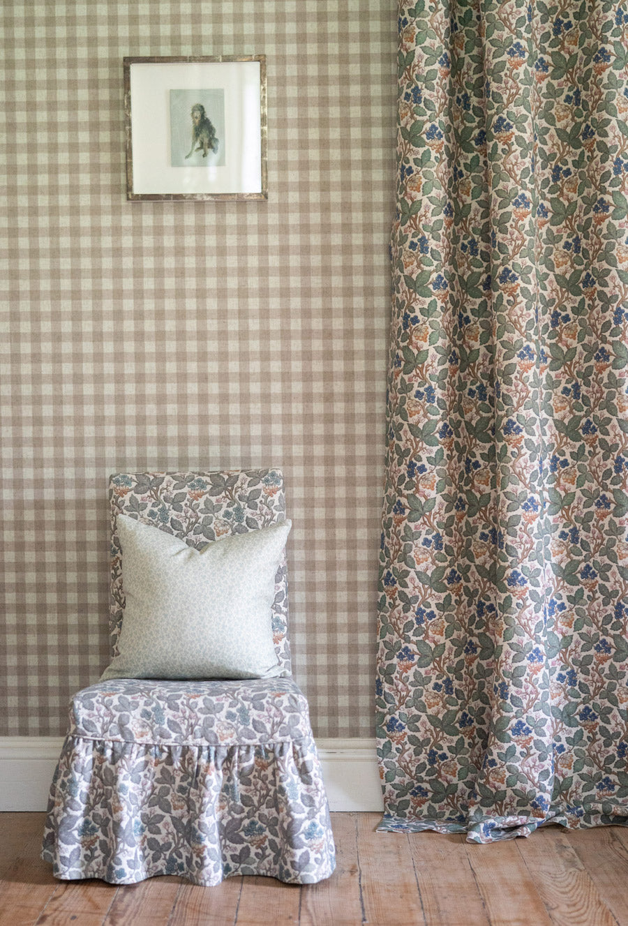 This pretty design originated in an antique wallpaper discovered behind a wooden shutter in an old farmhouse on the Inchyra estate in Perthshire, Scotland. The shutters had been nailed shut for many years and, on removing them for a refurbishment of the house, the wallpaper was uncovered. Briar adds a useful slightly smaller-scale main design than we have released lately and, as well as being a stunning main print for a scheme, is also extremely effective at pulling a scheme together. Briar is finished with our specialist processes to produce a pleasingly aged and softened linen.